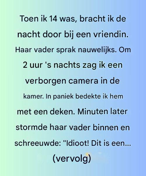 Toen ik 14 was, bracht ik de nacht door in het huis van mijn vriend. Haar ouders, vooral haar vader, spraken nauwelijks. Om 2 uur ‘s nachts zag ik een verborgen camera in de kamer. Ik raakte in paniek en gooide een deken om het te bedekken. Twee minuten later stormde haar vader naar binnen en schreeuwde: « ! Dat is een bewakingscamera – ik gebruik hem om de straat in de gaten te houden! » Ik schaamde me helemaal.