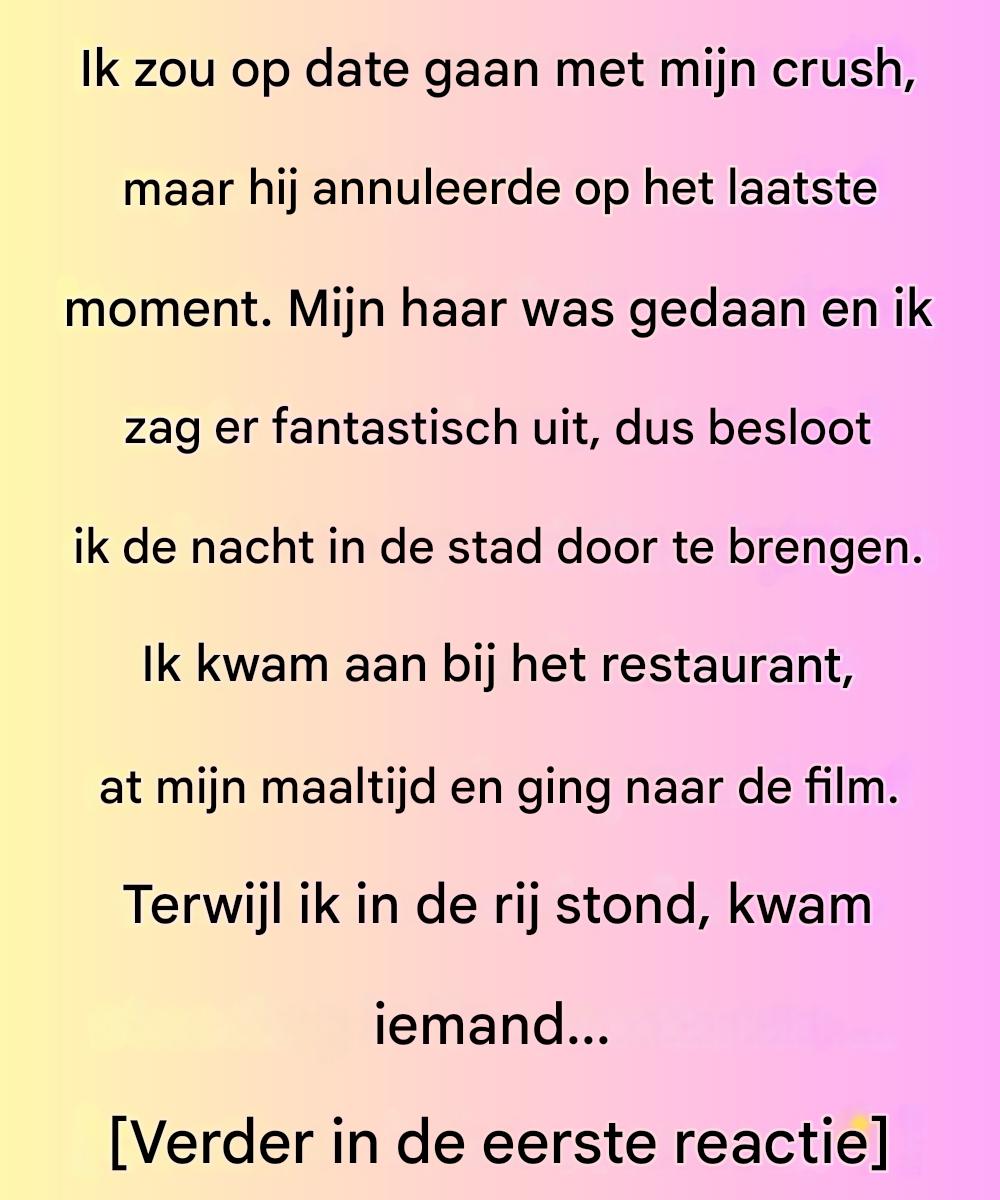 Ik zou op date gaan met mijn vriend, maar hij zei op het laatste moment af. Mijn haar was al gedaan en ik zag er fantastisch uit, dus besloot ik om de avond uit te gaan. Ik kwam aan in het restaurant, at wat en ging naar de film.