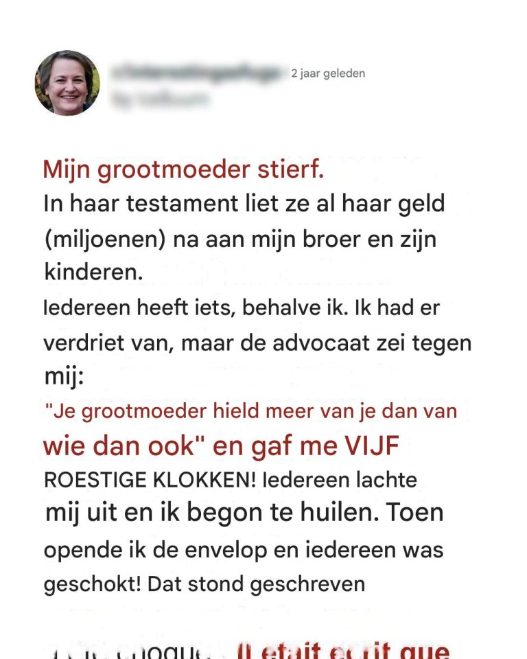 Linda erft de oude klokken van haar grootmoeder, terwijl haar hebzuchtige broer het huis krijgt. Onbewust ontving ze bijna $ 200.000