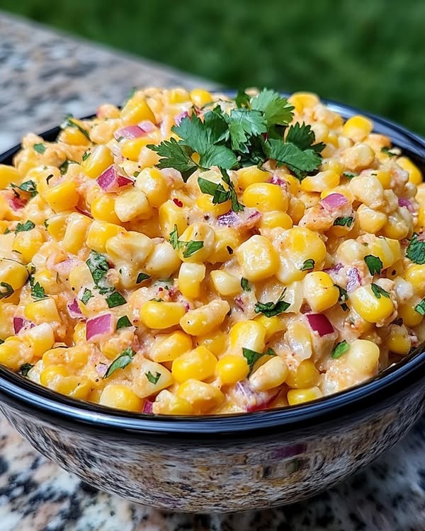 Ingrediënten: 4 kopjes maïskorrels (vers, uit blik of bevroren) 1 kopje mayonaise 1 kopje zure room 1 1/2 kopje geraspte Mexicaanse kaas 1 blik (4 oz) in blokjes gesneden groene chilipepers, uitgelekt 1/2 kopje gehakte groene uien 1/4 kopje gehakte verse koriander Bereidingswijze:
