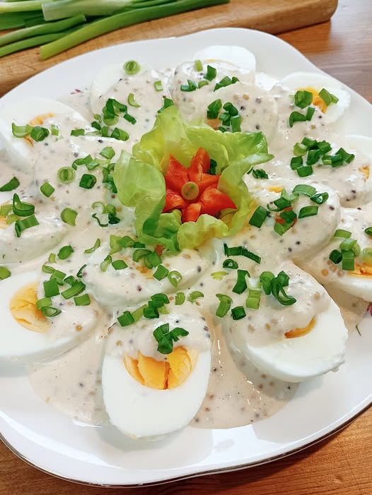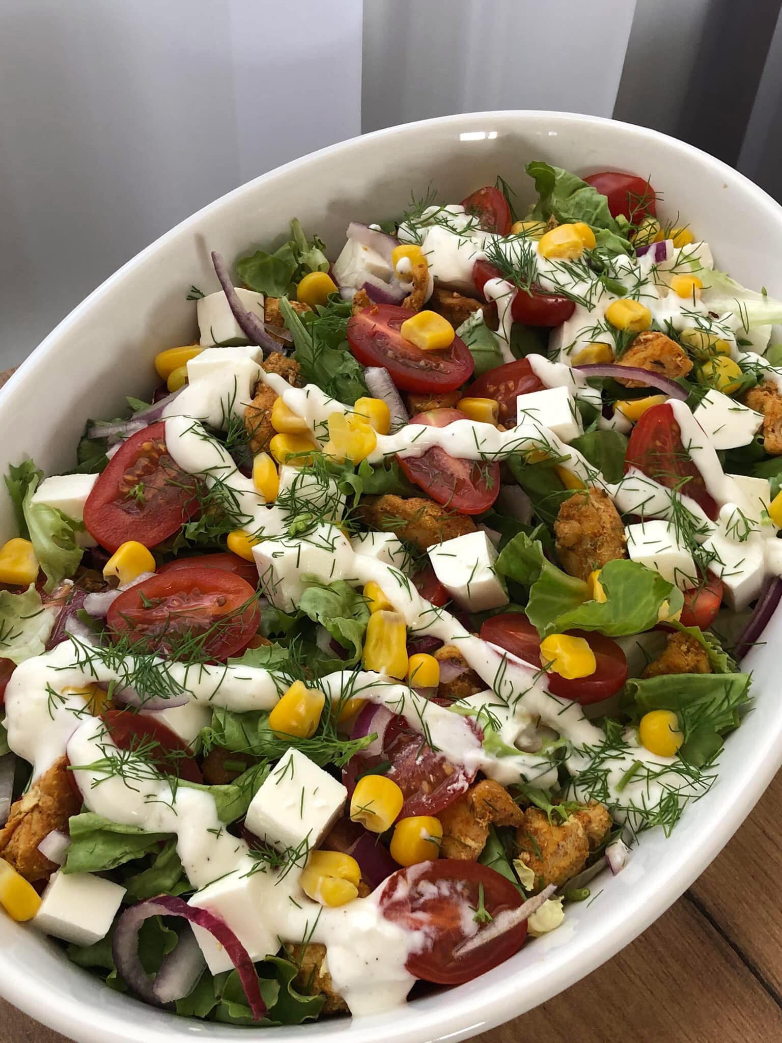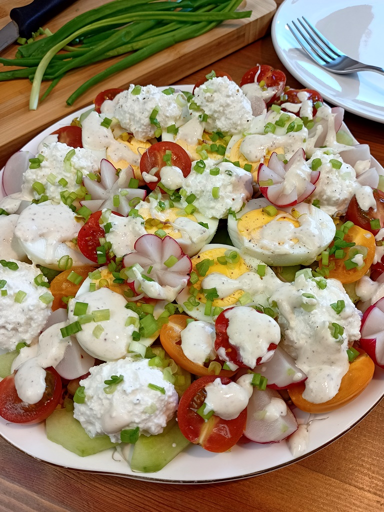 Een kleurrijke en feestelijke salade, perfect voor de paasbrunch of -lunch. Boordevol verse ingrediënten en een heerlijke dressing! Ingrediënten: 5 hardgekookte eieren 5 cherrytomaatjes 3-4 radijsjes Halve komkommer 100 g radijskiemen Bieslook Ongeveer 100 g kwark + een beetje naturel yoghurt Dressing: