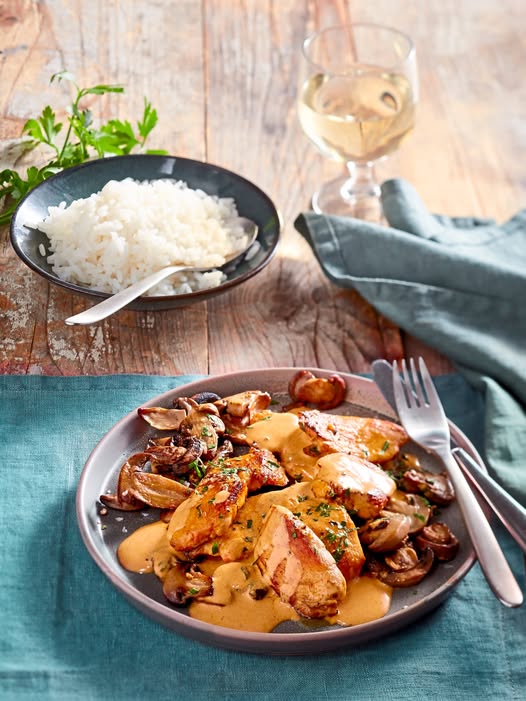 Ingrediënten (voor 4 personen): 500 g gemengde paddenstoelen (bijv. champignons, kastanjechampignons en oesterzwam) 2 el boter 4 el olie Zout en peper 500 g kipfilet 6 takjes tijm 200 g crème fraîche 1 el mosterd 1 tl paprikapoeder Bereidingswijze: