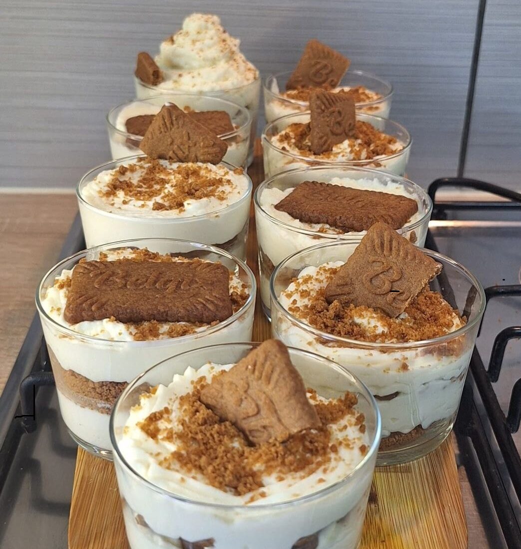 Aantal porties: 10 dessertglazen Voorbereidingstijd: 20 minuten + minimaal 6 uur koelen Ingrediënten Voor het beslag: 500 g mascarpone 500 ml room (minimaal 33% vet) 6 eetlepels suiker 2 zakjes vanillesuiker Speculooskoekjes Voor de chocomelkdip: