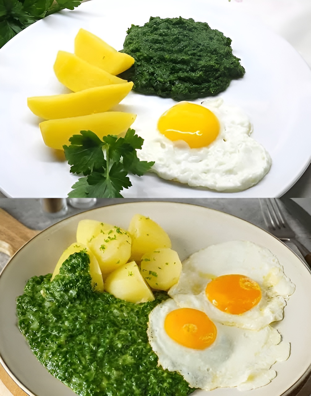 Ingrediënten: 500 g verse spinazie 1 kleine ui 3 el boter 2 el bloem 1 el vloeibare room Zout en peper naar smaak Een snufje geraspte nootmuskaat Optioneel: een beetje bouillonpoeder (zoals Aromat of Fondor) 4 eieren 1 tl olie om te bakken 3 aardappelen, geschild en in stukken gesneden Bereiding: Was de verse … Lire plus