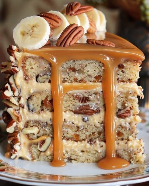 Deze decadente bananen pecan caramel laagjestaart is een droom die uitkomt voor elke zoetekauw! De combinatie van de zachte, vochtige bananencake, de knapperige pecanen en de rijke, romige caramel frosting maakt dit een onweerstaanbaar dessert voor elke gelegenheid. Perfect voor verjaardagen, feestdagen of gewoon om jezelf eens te verwennen.