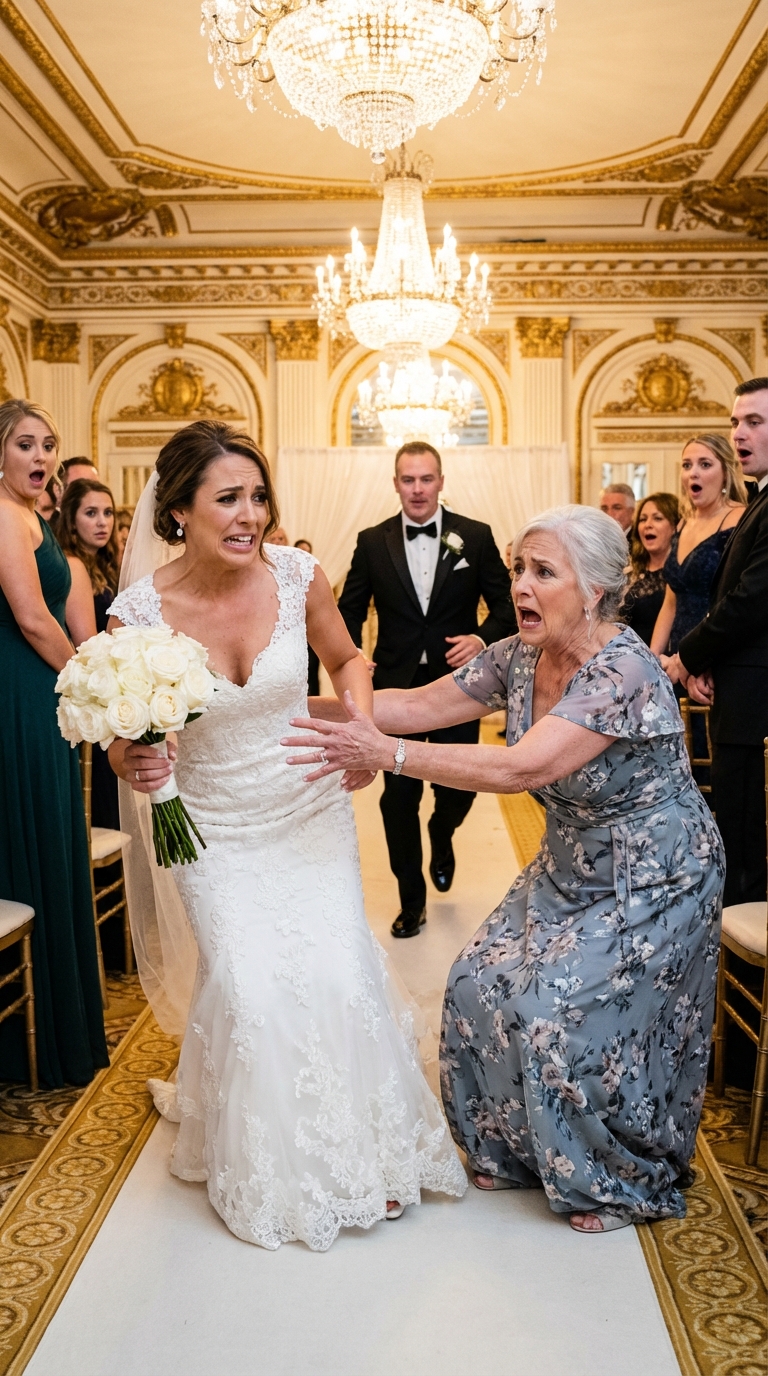 Op mijn bruiloft schoof mijn moeder stilletjes een opgevouwen briefje in mijn hand. Er stond maar één woord op: « Vertrek. » Toen ik bij het altaar stond, deed ik alsof ik struikelde en viel ik op de grond. « Ze heeft haar enkel verstuikt! » riep mijn moeder. « Stop de bruiloft – bel een ambulance! » Terwijl de sirenes arriveerden en we samen werden afgevoerd, boog ze zich naar me toe en fluisterde iets dat me volledig van streek maakte.