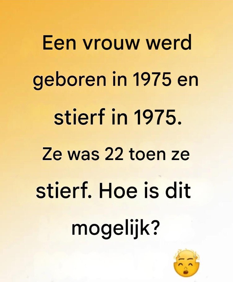 Een raadsel laat het internet perplex achter: hoe kan iemand in hetzelfde jaar geboren en gestorven worden en toch 22 jaar oud worden? Een raadselachtige afbeelding is online viraal gegaan, heeft veel aandacht getrokken en talloze gebruikers in verwarring gebracht. De afbeelding toont een schijnbaar onmogelijk scenario: « Een vrouw werd geboren in 1975 en stierf in … Lire plus