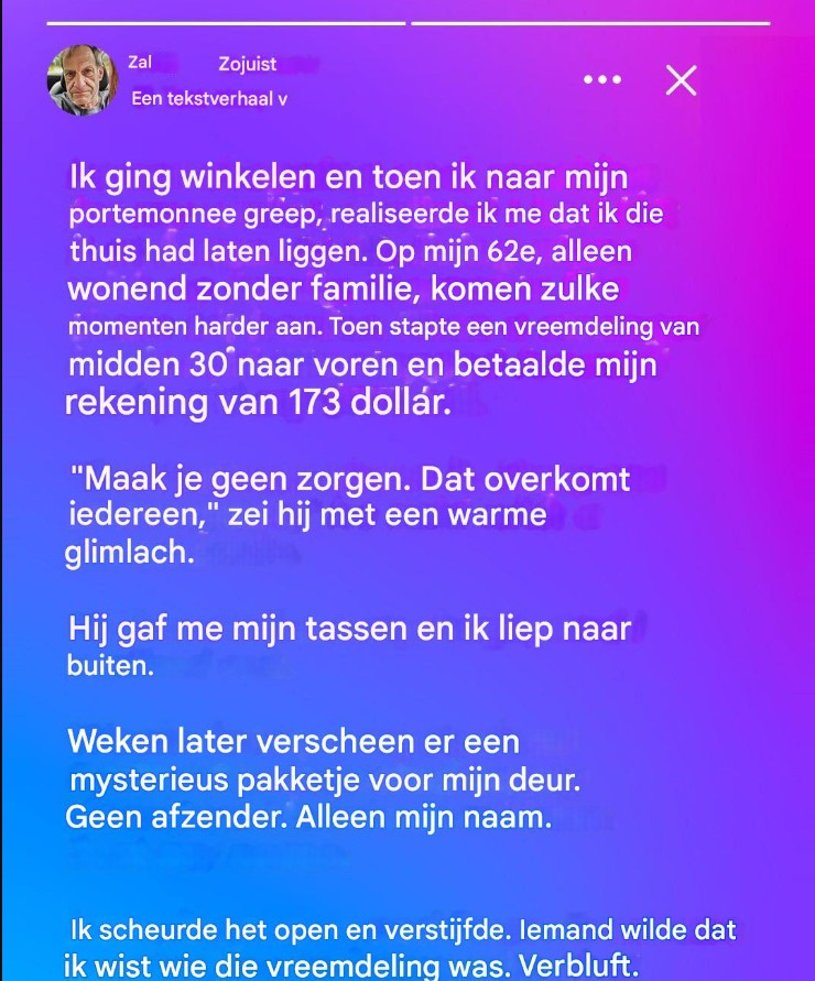 Ik was 62 jaar oud en woonde alleen in een schemerig, krakend appartement dat vaag naar mottenballen en herinneringen rook. Mijn huis was gevuld met kortingsbonnen, verbleekte foto’s en souvenirs van betere tijden, lang geleden. Spijt was een onwelkome, constante metgezel geworden. Jarenlang had ik me neergelegd bij een eenzaam bestaan ​​en verwachtte ik niets meer dan routine en stille berusting van vreemden. Ik geloofde al lang niet meer dat vriendelijkheid voor mensen zoals ik bedoeld was.