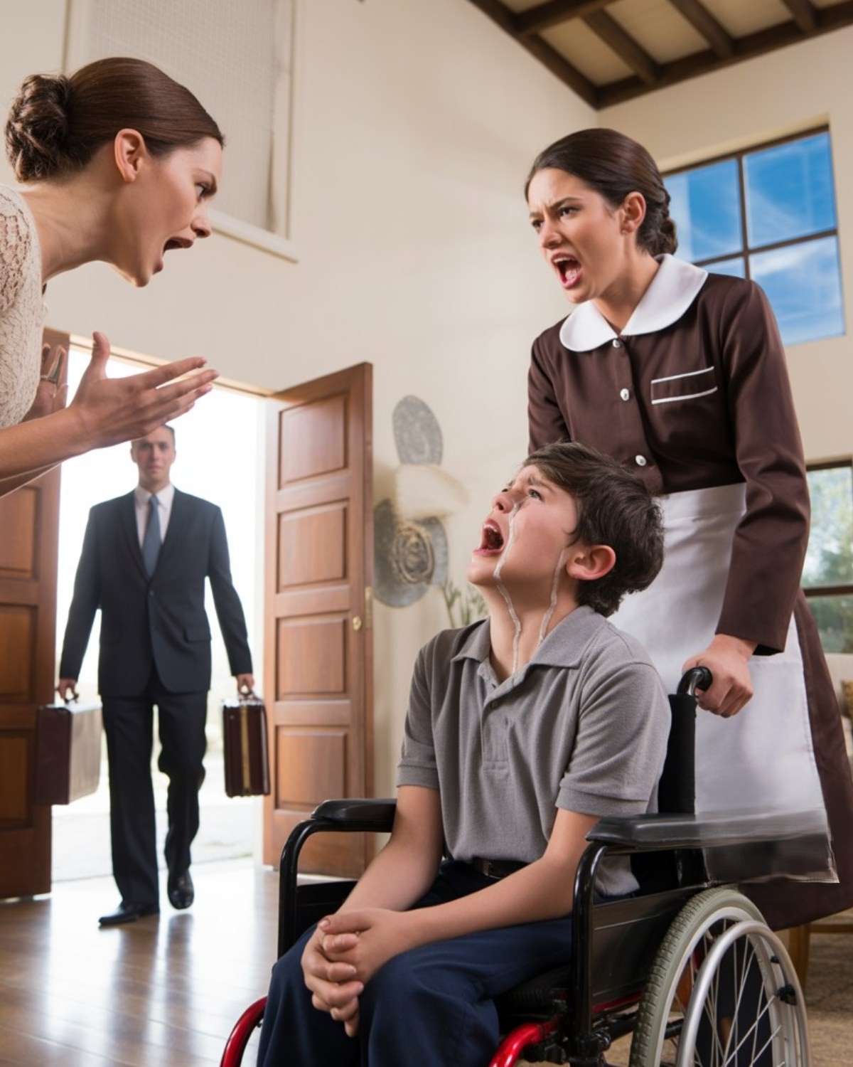 Hij stond daar maar… starend naar zijn zoon die op de grond lag en zich vastklampte aan de huishoudster alsof zij het enige vaste ding in de wereld was.