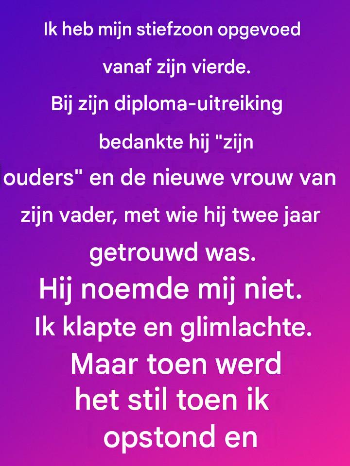 Ik heb mijn stiefzoon opgevoed vanaf zijn vierde. Tijdens zijn diploma-uitreiking bedankte hij « zijn ouders » en de nieuwe vrouw van zijn vader, met wie hij twee jaar getrouwd was. Hij noemde mij niet. Ik klapte en glimlachte. Maar toen werd het stil toen ik opstond en naar het podium liep, niet boos of teleurgesteld, maar met een kalmte waarvan ik niet eens wist dat ik die bezat. Ik wilde gewoon dat hij me zag – niet als iemand die erkenning eiste, maar als iemand die hem al meer dan tien jaar in stilte liefhad.