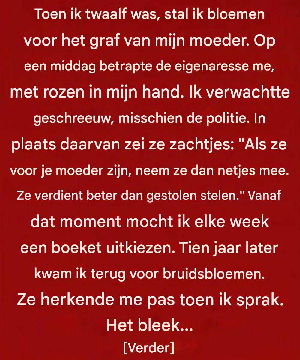 Ze was het jaar ervoor overleden, en mijn vader werkte lange dagen, te moe om te merken hoe vaak ik stiekem wegging. Ik had geen geld. Maar door bloemen naar haar te brengen, voelde ik me dicht bij haar – alsof iets moois ons nog steeds kon verbinden.
