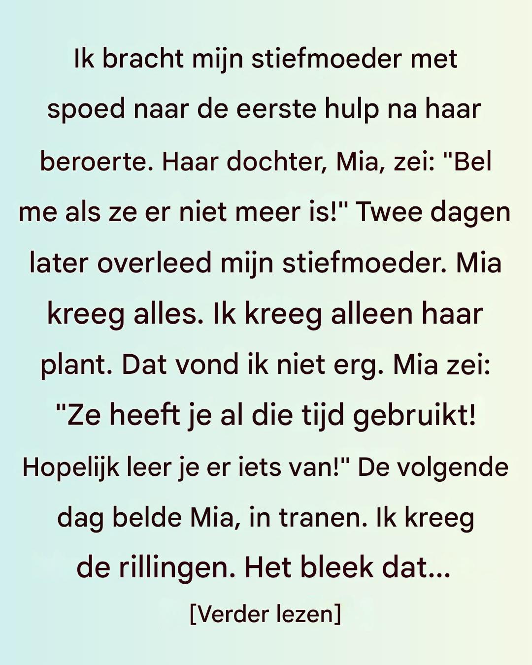 Bij de voorlezing van het testament verscheen Mia in zwarte designerkleding, met een uitdrukkingloos gezicht. Ze erfde alles: het spaargeld van mijn stiefmoeder, haar appartement, haar sieraden, zelfs de meubels. Toen de advocaat zich tot mij wendde, gaf hij me één enkel voorwerp: een oude potplant.