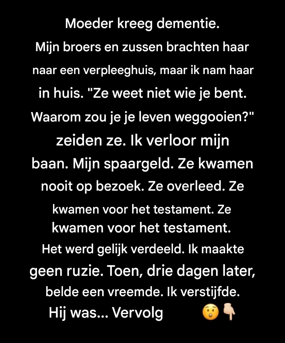 Mijn broers en zussen reageerden snel en efficiënt. Ze hadden het over faciliteiten, wachtlijsten, maandelijkse kosten – cijfers vlogen heen en weer alsof het zakelijke gegevens waren. Ik bleef stil, want ik wist al wat ik zou antwoorden.