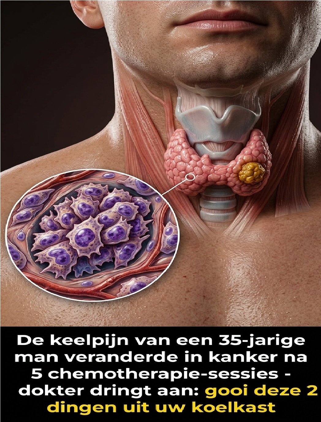 Toen de 35-jarige Minh, een ogenschijnlijk gezonde kantoormedewerker, voor het eerst last kreeg van aanhoudende keelpijn, dacht hij dat het gewoon een verkoudheid was of het gevolg van lange werkdagen en stress. Hij behandelde het met zuigtabletten en huismiddeltjes, in de verwachting dat het binnen een paar dagen over zou gaan. Maar weken gingen voorbij en de pijn verbeterde niet – integendeel, het werd erger. Toen hij uiteindelijk naar een specialist ging, was de diagnose schokkend: keelkanker in stadium 2. Na vijf intensieve chemotherapiesessies gaf zijn arts niet alleen advies over herstel, maar ook een onverwachte waarschuwing. « Als u uzelf en uw gezin wilt beschermen, gooi dan deze twee dingen onmiddellijk uit uw koelkast », zei de arts.