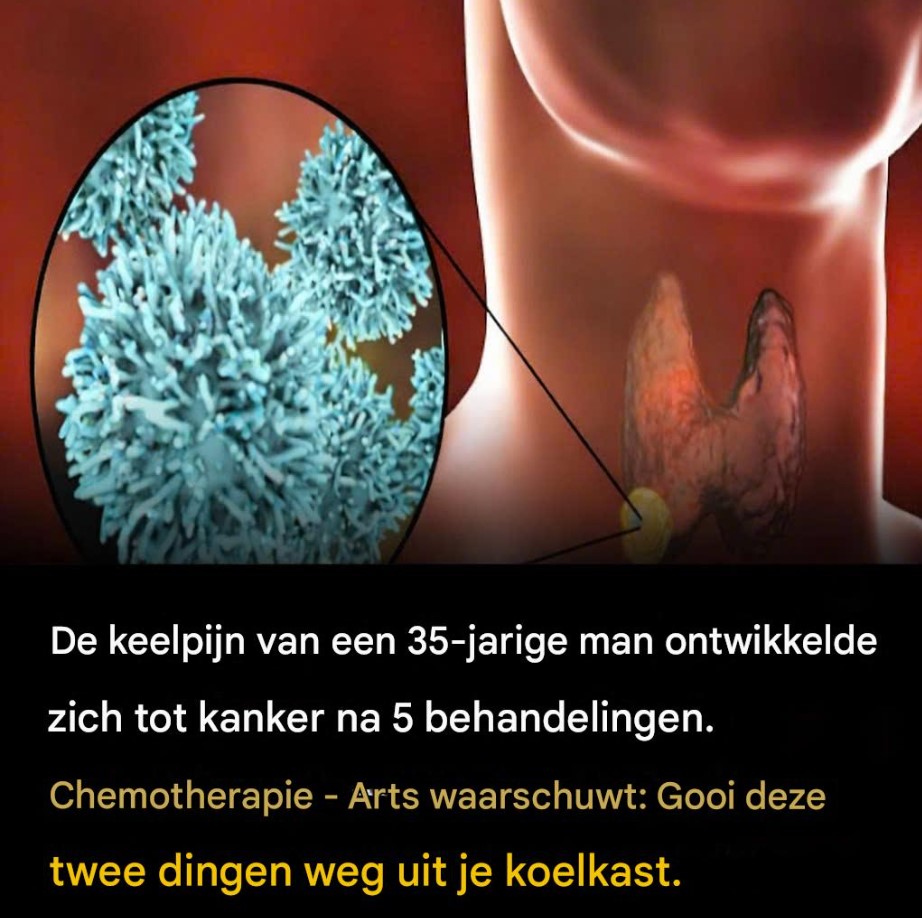 Toen Minh, een 35-jarige ogenschijnlijk gezonde kantoormedewerker, voor het eerst last kreeg van aanhoudende keelpijn, dacht hij dat het gewoon een verkoudheid was of het gevolg van lange werkdagen en stress. Hij behandelde het met zuigtabletten en huismiddeltjes, in de hoop dat het binnen een paar dagen over zou gaan. Maar weken gingen voorbij en de pijn werd niet minder – integendeel, het werd erger. Toen hij uiteindelijk naar een specialist ging, was de diagnose schokkend: keelkanker in stadium 2. Na vijf intensieve chemotherapiesessies gaf zijn arts hem niet alleen advies over herstel, maar ook een onverwachte waarschuwing. « Als u uzelf en uw familie wilt beschermen, gooi deze twee dingen dan onmiddellijk uit de koelkast », zei de arts.