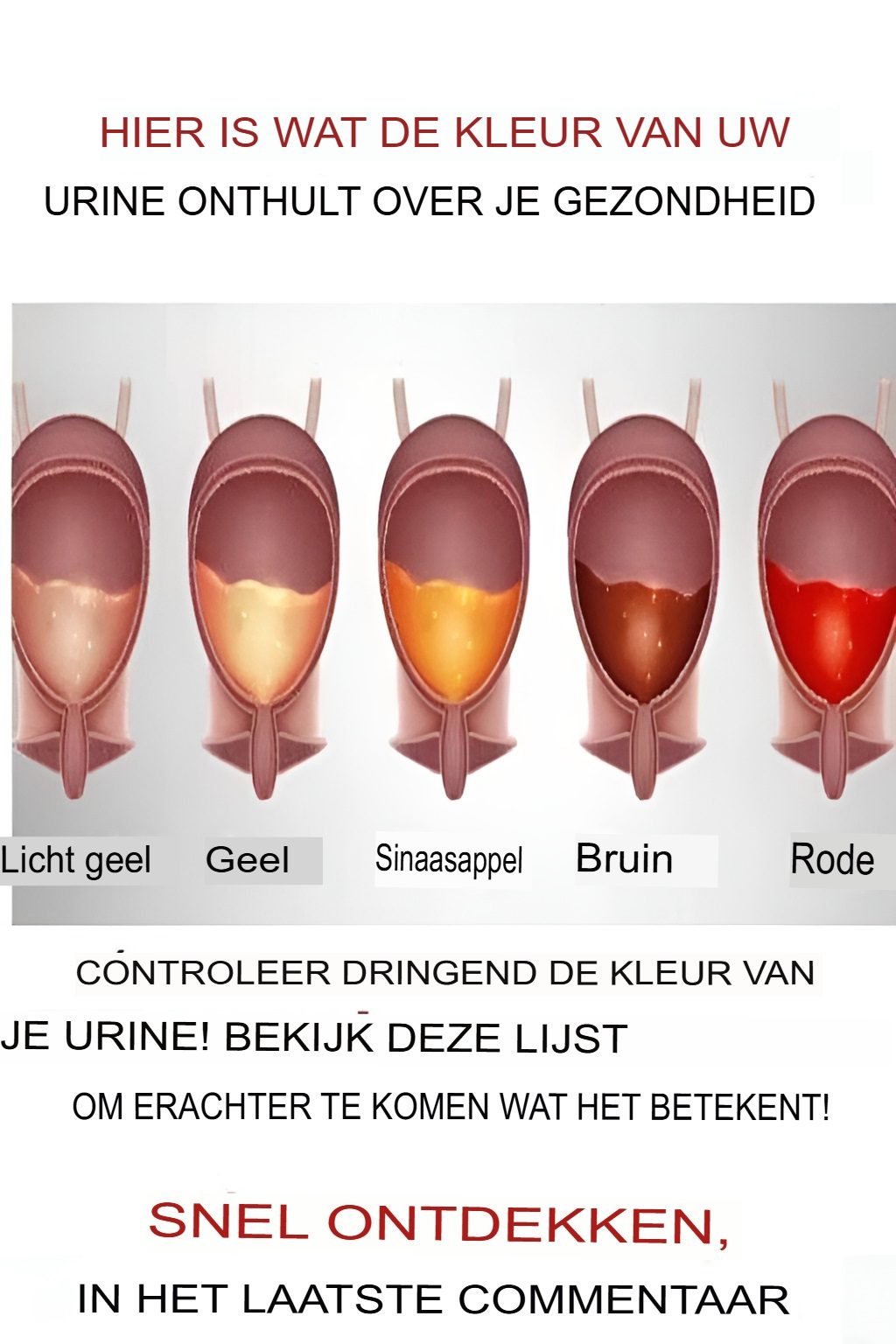 De urinestroom is een gezonde indicator voor het hydratatieniveau en het volumeniveau. zichtbare vind je een een overzicht van wat verschillende kleuren van urine kunnen volgen: