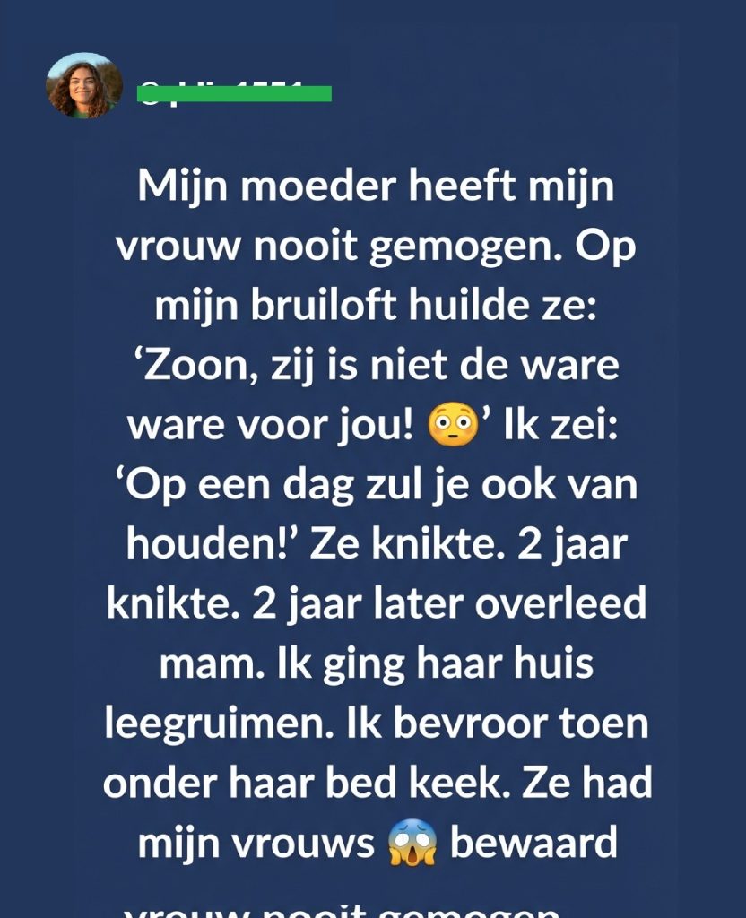 Mijn moeder heeft mijn vrouw nooit echt geaccepteerd. Vanaf het moment dat we verloofd waren, hield ze afstand – beleefd maar koud, altijd een deel van zichzelf verborgen houdend. Het was geen openlijke vijandigheid, geen scherpe woorden of directe afwijzing, maar een constante kilte die in kleine gebaren zat. In de manier waarop ze vragen stelde zonder echt te luisteren. In hoe ze glimlachte zonder haar ogen te laten meedoen. In het feit dat ze mijn vrouw altijd met haar naam aansprak, maar nooit met de warmte die ze voor anderen leek te bewaren.
