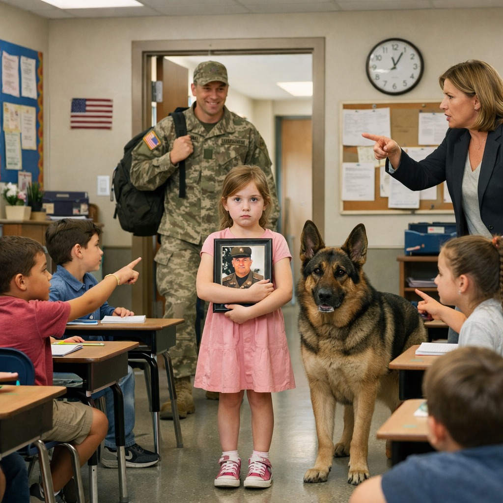 De lerares schaamde haar omdat ze had gelogen over haar vader, die marinier was — keek toen naar de deur en verstijfde…