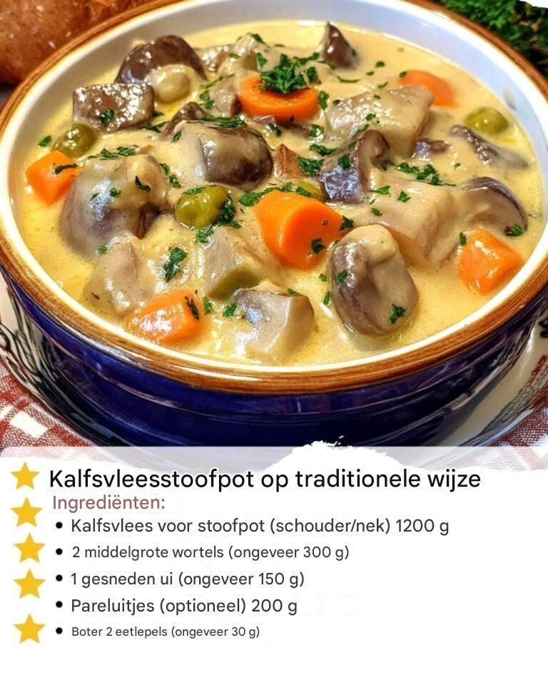 - 1 kg kalfsvlees: kies stukken zoals schouder, borst of runderborst voor een malse textuur.