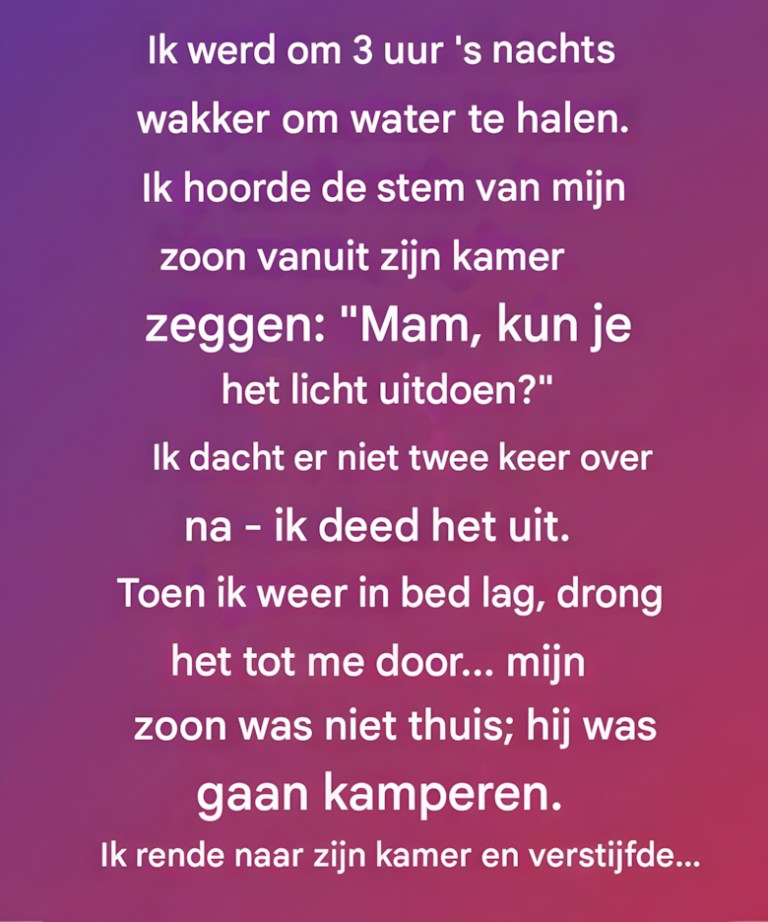Ik werd om 3 uur ‘s nachts wakker, dorstig en suf. Het huis was stil, gehuld in de stilte van de vroege ochtend.