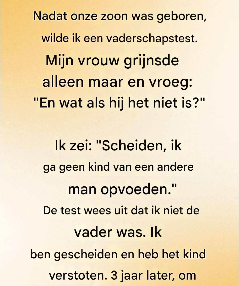 Ik draaide me om en keek haar aan. De vaderschapstest voelde zwaar in mijn handen – als een combinatie van pantser en munitie. Ze droeg de oversized trui die ze al sinds de bevalling droeg, haar haar nonchalant vastgebonden, donkere kringen onder haar ogen van de eindeloze nachten. Ze zag er kwetsbaar uit. Echt. Onvoorbereid op wat ik op het punt stond te doen.