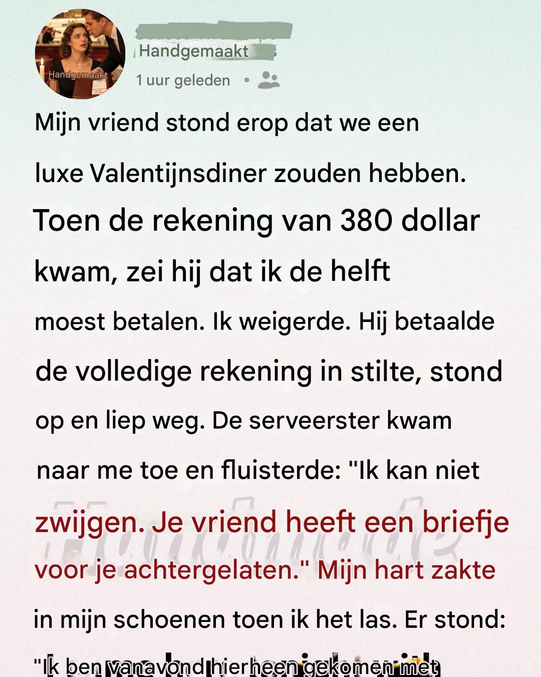 Niet zomaar een restaurant — zo’n restaurant waar geen prijzen op de menukaart staan ​​en de kaarsen hoger zijn dan de wijnglazen. Hij had drie weken van tevoren gereserveerd en zei, bijna trots: « Jij verdient iets bijzonders met Valentijnsdag. »