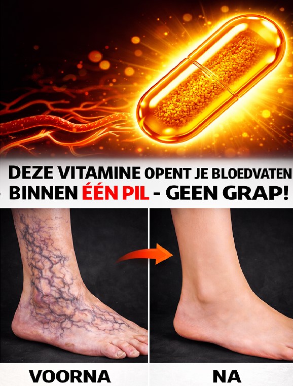 Je kijkt naar je benen en ziet die kronkelende, uitpuilende aderen die langdurig staan ​​oncomfortabel maken. ‘s Avonds sluipt de zwelling erin, misschien met een zwaar, pijnlijk gevoel dat je dag verstoort. Dan valt je oog op een opvallend bericht: een dokterachtig figuur wijst naar een gloeiende oranje capsule, met de belofte dat deze ene vitamine de aderen in één dosis op spectaculaire wijze ‘opent’ – geen grap. Dramatische voor-en-na-foto’s laten zien hoe rode, gezwollen enkels in één nacht veranderen in gladde, normale enkels. Vooral voor oudere volwassenen hebben een slechte bloedsomloop in de benen en spataderen invloed op het dagelijkse comfort, de mobiliteit en het zelfvertrouwen. Het idee van een vitamine die snel werkt, klinkt aantrekkelijk. Maar levert een vitamine echt zulke directe, aderopenende resultaten op? Laten we eens kijken naar het bewijs achter deze beweringen en wat nu echt bijdraagt ​​aan een betere bloedsomloop en gezonde aderen.