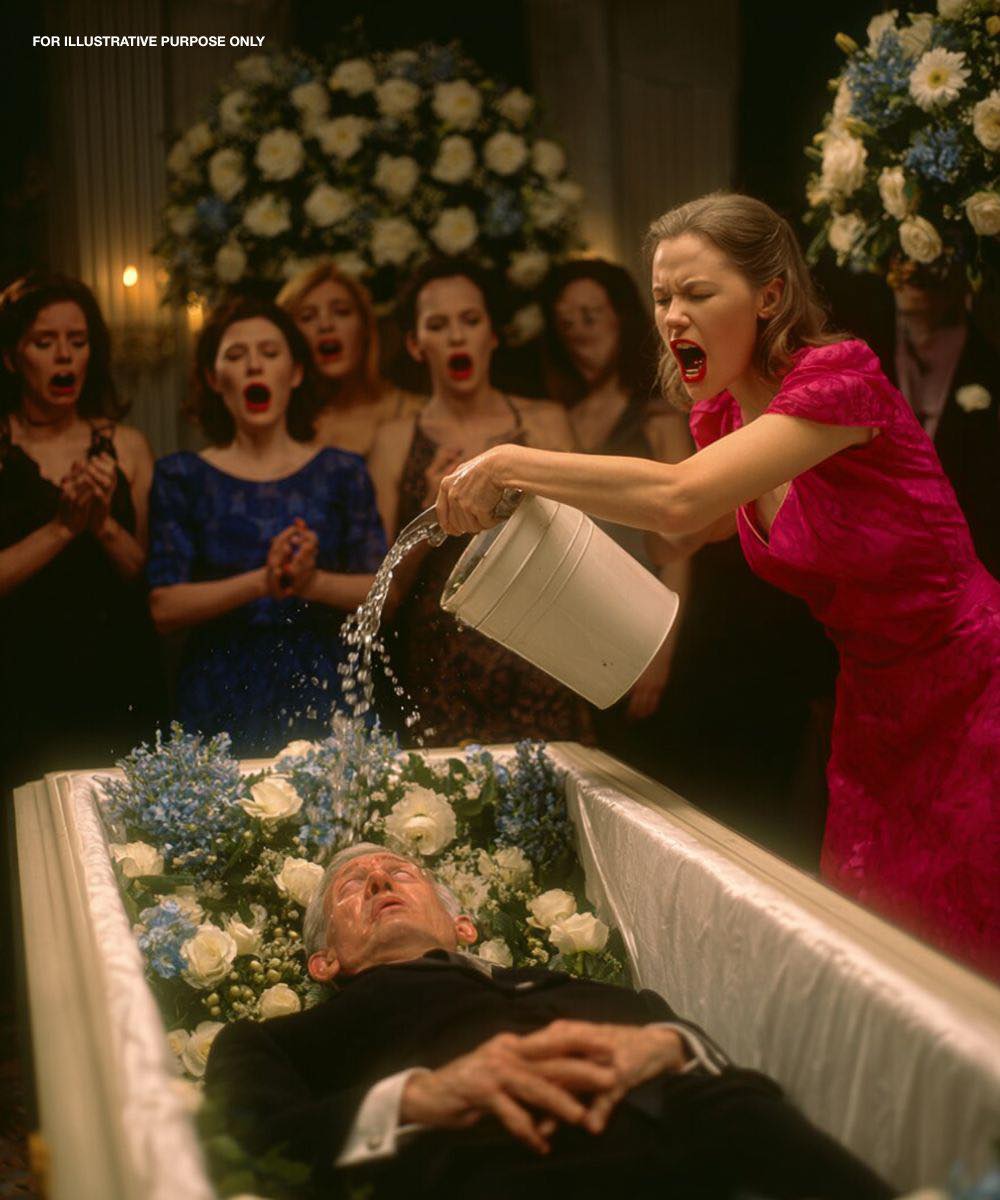 De vrouw liep naar de kist van haar man en goot de emmer over zijn gezicht.