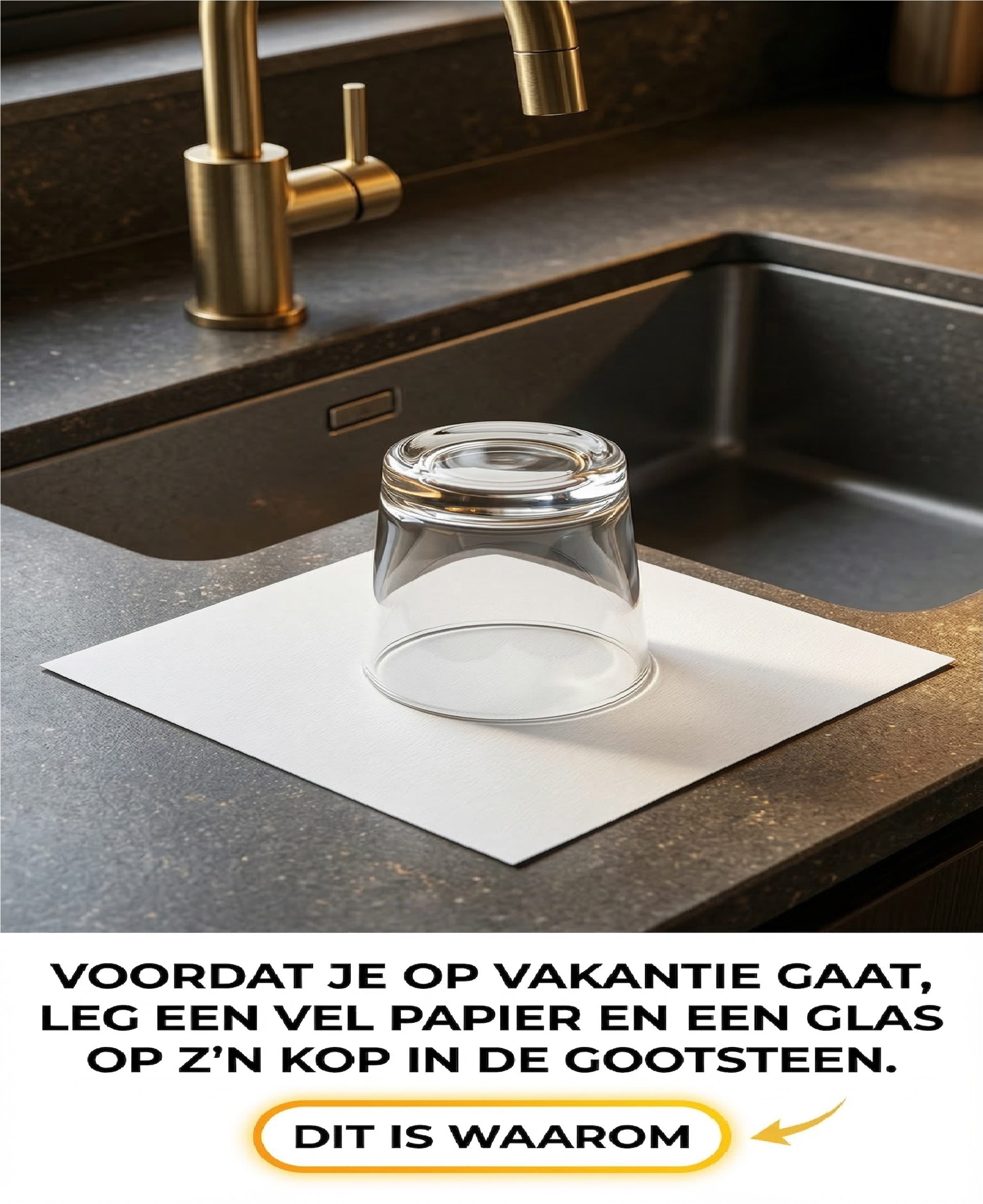 Deze simpele truc houdt in dat je een vel absorberend papier (zoals keukenpapier of een vaatdoek) over de opening van de gootsteen legt en daar vervolgens een omgekeerd glas op plaatst.