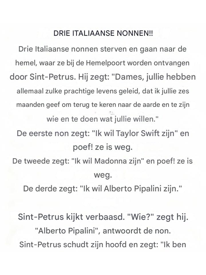 Bij de Hemelpoort, onder wolken die zo keurig gerangschikt waren als in een kunstmuseum, arriveerden drie Italiaanse nonnen na een lang en trouw leven. Petrus verwelkomde hen hartelijk en glimlachte terwijl hij hun namen van een glanzende lijst afstreepte. « Zusters, » zei hij vriendelijk, « jullie hebben geleefd met mededogen, nederigheid en een goed humeur. Als beloning schenkt de Hemel jullie iets bijzonders. Jullie mogen zes maanden terugkeren naar de aarde en zijn wie jullie willen, doen wat jullie maar willen – gewoon voor de lol. » De nonnen keken elkaar vol verbazing aan. Een leven lang regels, routines en stille discipline, en nu… totale vrijheid. Hun ogen fonkelden als die van kinderen die langer mochten opblijven dan normaal.