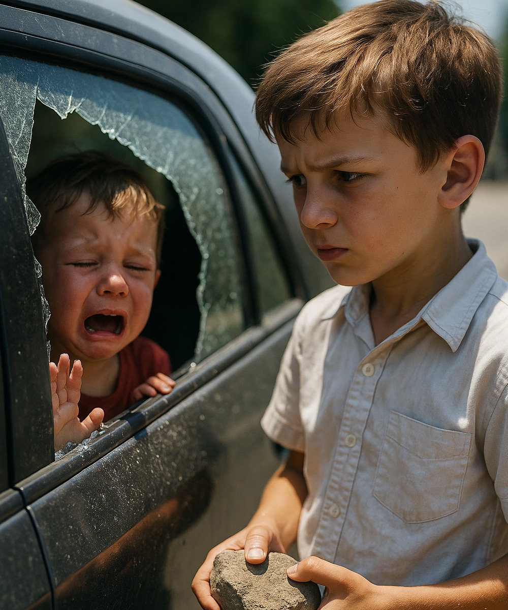 Toen hij de straat overstak, viel zijn oog op iets. Een grijze auto stond langs de stoeprand geparkeerd. Binnen, op de passagiersstoel, zat een klein kind, niet veel ouder dan zijn broertje. Het kind huilde en bonkte zwakjes tegen het glas, zijn stem schor van het roepen om hulp. Zijn wangen waren rood en hij haalde onregelmatig adem. De hitte in de auto was ondraaglijk.