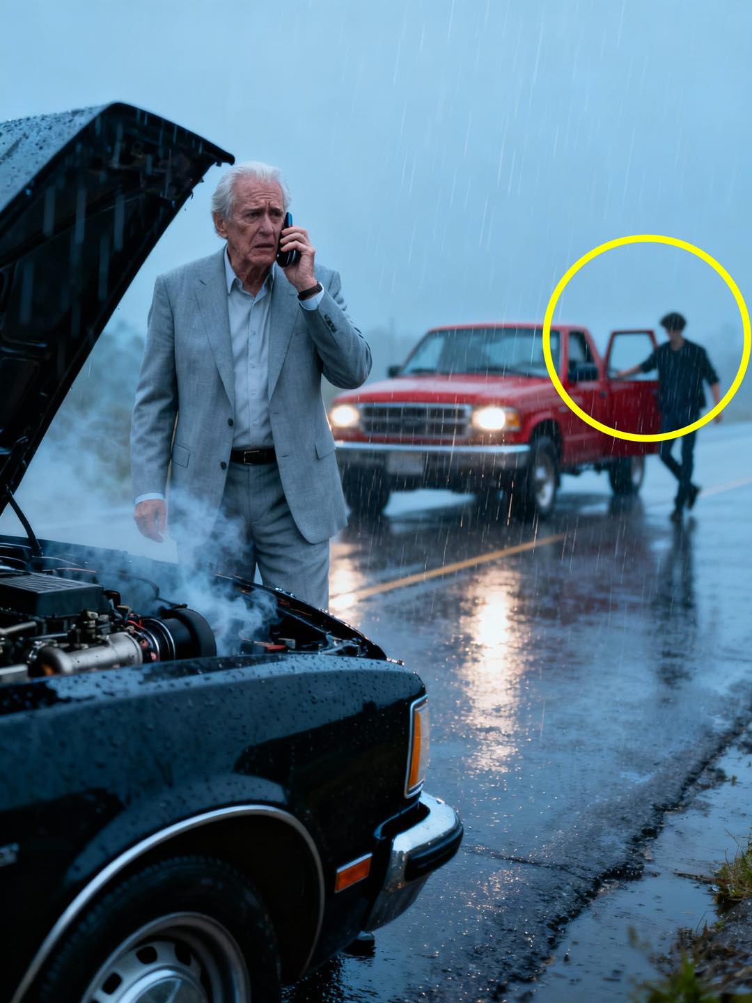 « M-mijn auto is kapot, » zei hij, terwijl hij naar een zwarte sedan wees waar stoom onder de motorkap vandaan kwam. « En mijn telefoon is leeg. »