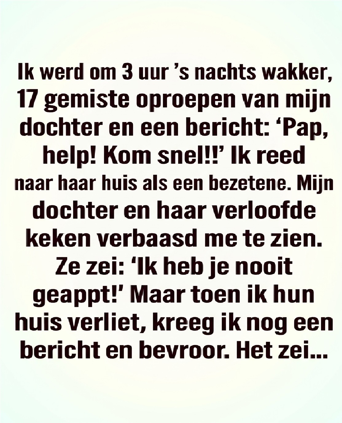 Ik werd om 3 uur ‘s nachts wakker door het trillen van mijn telefoon. Zeventien gemiste oproepen van mijn dochter en één berichtje zorgden ervoor dat ik helemaal overstuur raakte: « Papa, help! Kom snel!! »