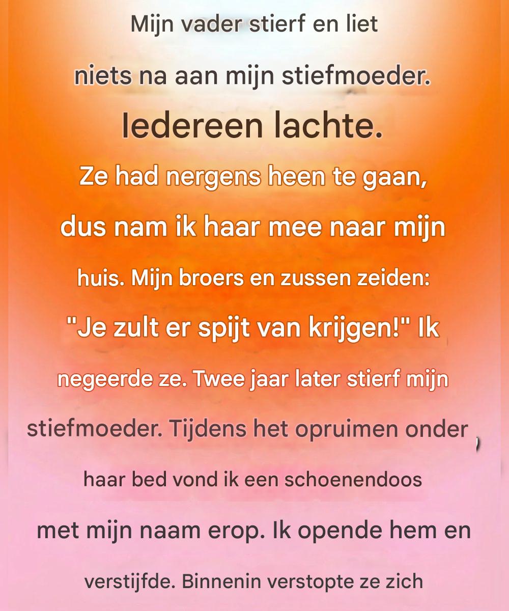 Het was niet het dramatische soort verdriet waar mensen het over hebben. Het was ongemakkelijk. Verontrustend. Gevuld met dingen die niemand zei en vragen die niemand durfde te stellen. Tijdens het voorlezen van het testament hing er een gespannen sfeer in de zaal die ik nog steeds moeilijk kan beschrijven.