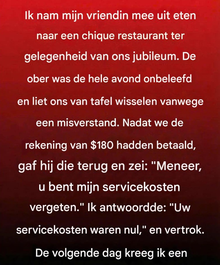 Ik had geld opzijgezet, mijn woorden zorgvuldig uitgekozen en een tafel gereserveerd in een restaurant dat bekendstond om zijn verfijnde ambiance. Alles aan de plek deed vermoeden dat het gemaakt was voor bijzondere gelegenheden: warme verlichting, smetteloos servies en de belofte van een onvergetelijke ervaring. Toen mijn vriendin arriveerde, deelde haar enthousiasme dat van mij, en even leek het erop dat de avond precies zo zou verlopen als ik me had voorgesteld.