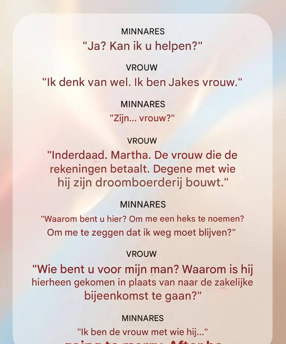 In plaats van boos te reageren, verraste Martha zichzelf. Ze stapte opzij en nodigde de vrouw binnen. Ze zaten tegenover elkaar aan de keukentafel, de lucht gespannen van verwarring en ongeloof. Langzaam vergeleken ze details – data, beloftes, gedeelde plannen die nu griezelig veel op elkaar leken. Ieder van hen had een versie van het verhaal gekregen waarin de ander gemakshalve werd buitengesloten. Wat het meest pijn deed, was niet alleen de mogelijkheid van verraad, maar ook het besef hoe gemakkelijk vertrouwen kan worden geschaad als er geen eerlijkheid is.