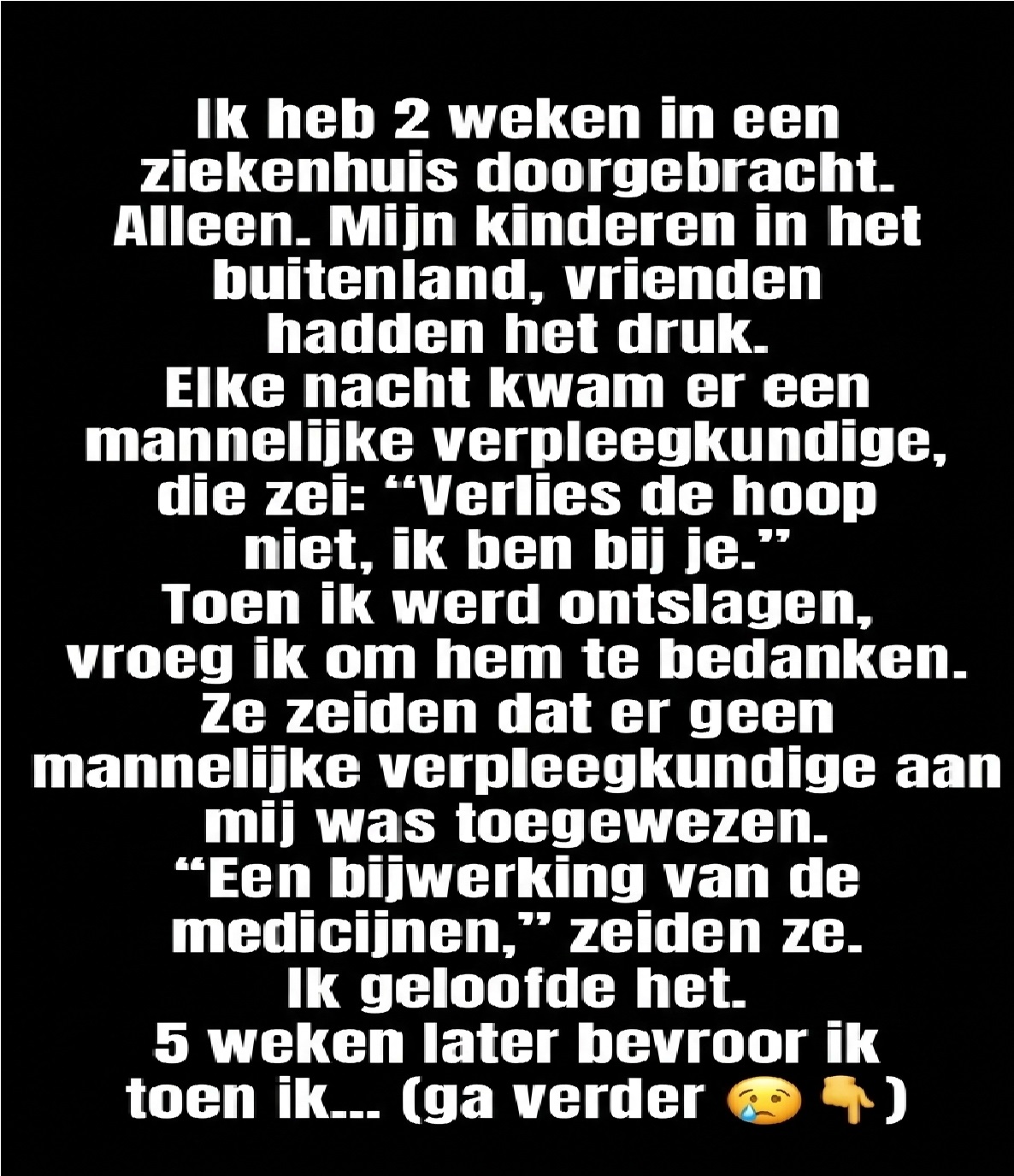 Gedurende de veertien dagen die ik in het ziekenhuis doorbracht, leek de tijd zijn vorm te verliezen. Ochtenden vloeiden over in middagen, middagen in lange, onrustige nachten. De kamer was altijd gevuld met geluid, maar tegelijkertijd vreemd leeg – het constante piepen van monitors, het zachte gesis van zuurstof, het verre gerol van karretjes over de gepolijste vloer. Toch hoorde ik geen bekende stemmen door de deur. Mijn kinderen woonden in verschillende steden en probeerden hun carrière en gezin te combineren. Vrienden stuurden beleefde berichtjes, maar kwamen zelden op bezoek. Bezoekuren kwamen en gingen als een vloedgolf die nooit helemaal de kust bereikte.