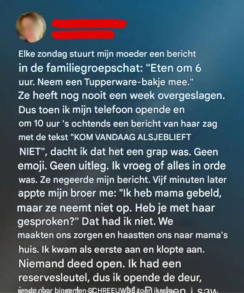 Dus toen ze op een zondagmiddag een kort berichtje stuurde met de simpele boodschap: « Kom alsjeblieft vandaag niet », zakte de moed me in de schoenen. Geen uitleg. Geen smiley. Slechts vijf onheilspellende woorden. Mijn broer en ik wisselden een blik en wisten meteen dat er iets niet klopte. We negeerden het bericht, stapten in de auto en reden rechtstreeks naar haar huis, terwijl de angst in onze borstkas toenam.