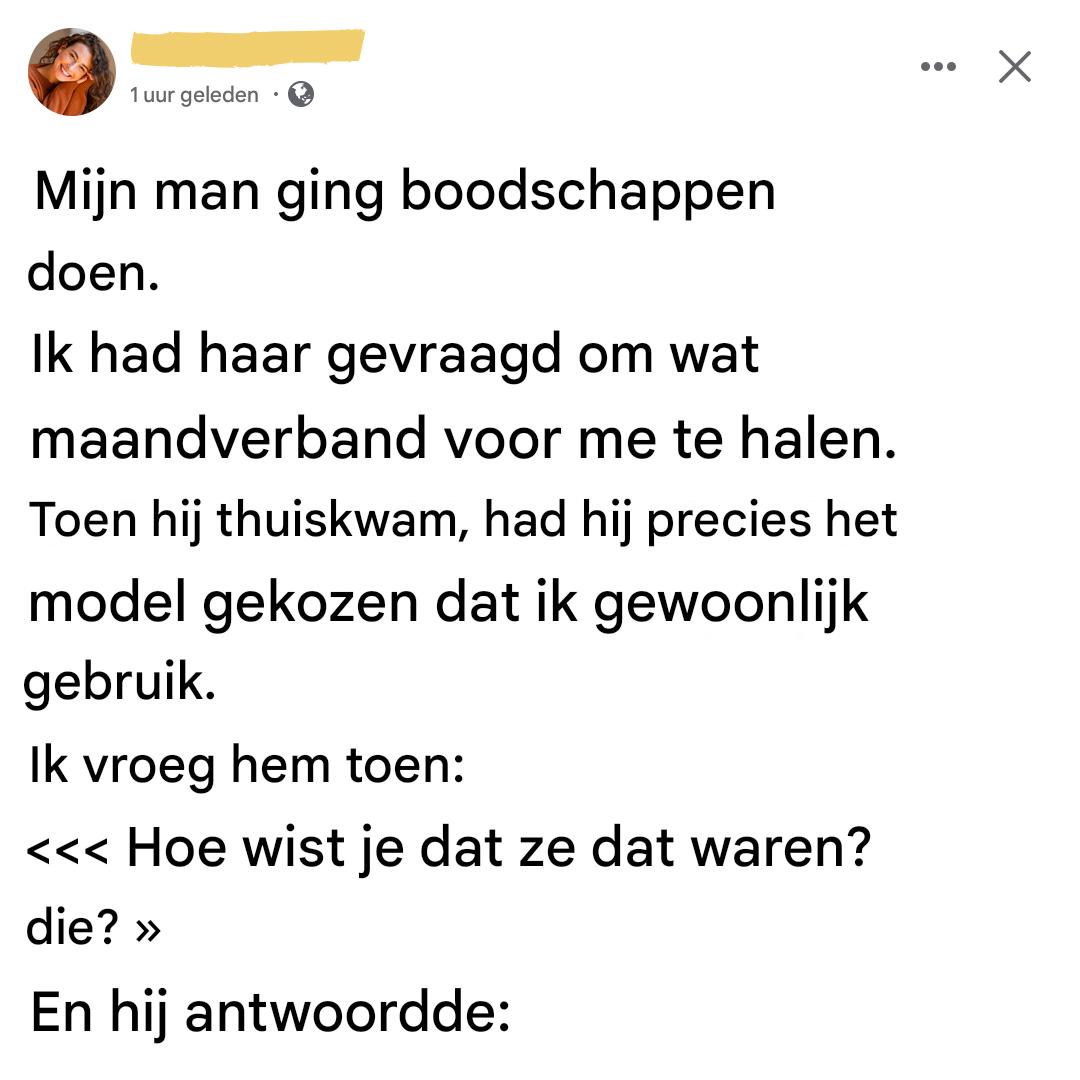Toen mijn man boodschappen ging doen, vroeg ik hem gewoon om onderweg wat maandverband mee te nemen. Eerlijk gezegd had ik me al voorbereid op het klassieke scenario: paniekerige berichtjes vanuit het gangpad, wazige foto’s, eindeloos geaarzel. Ik had de lachbuien bijna al verwacht… of de berusting.