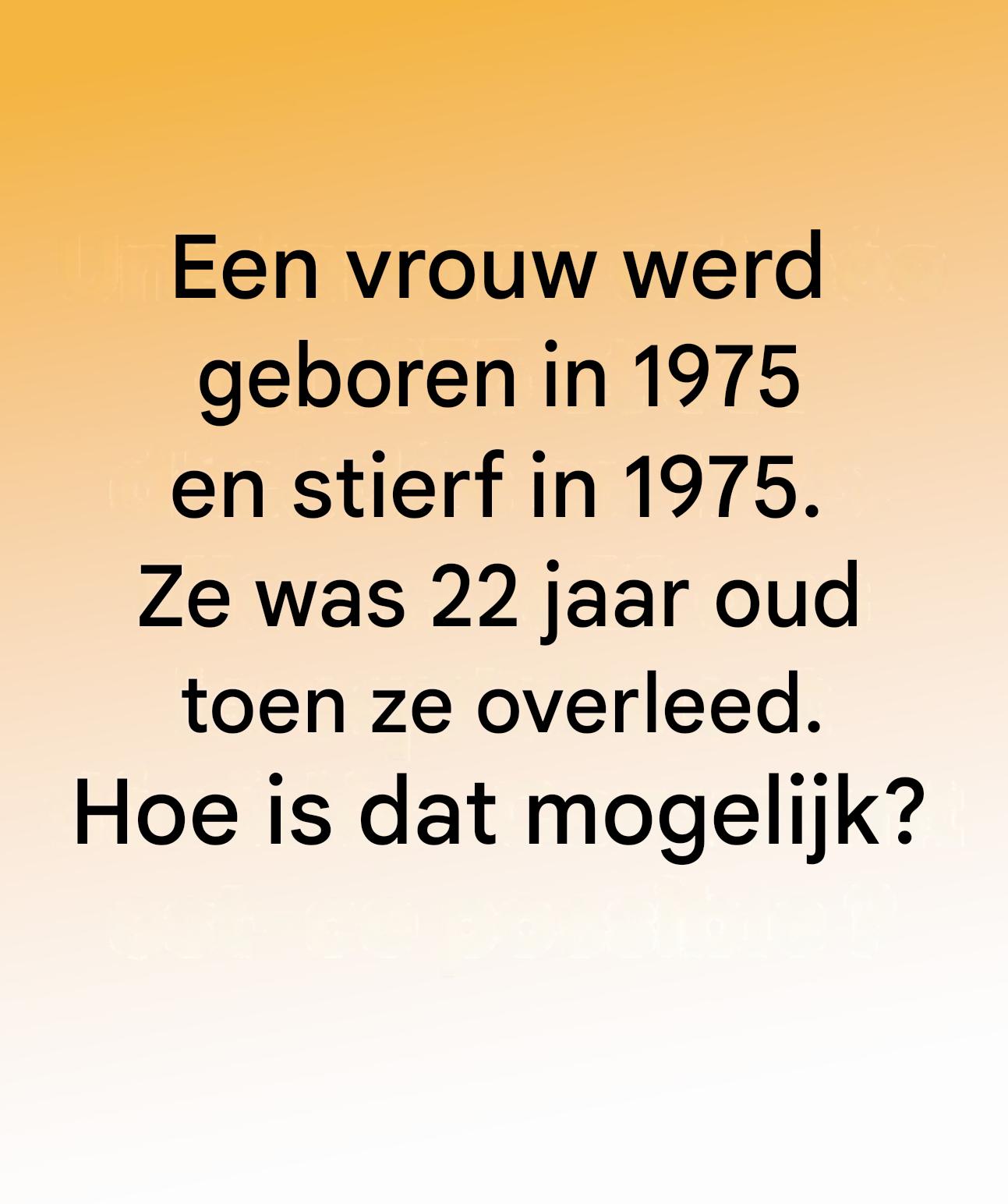 Op het eerste gezicht is het zo’n zin die je hersenen even doet vastlopen. « Een vrouw werd geboren in 1975 en stierf in 1975. Toch was ze 22 jaar oud. » Een seconde stilte, en dan fluistert dat stemmetje in je hoofd: Wacht… wat? Precies daarom ging dit raadsel viraal. Het speelt in op onze automatische leesgewoonten en vooral op onze neiging om te snel conclusies te trekken.