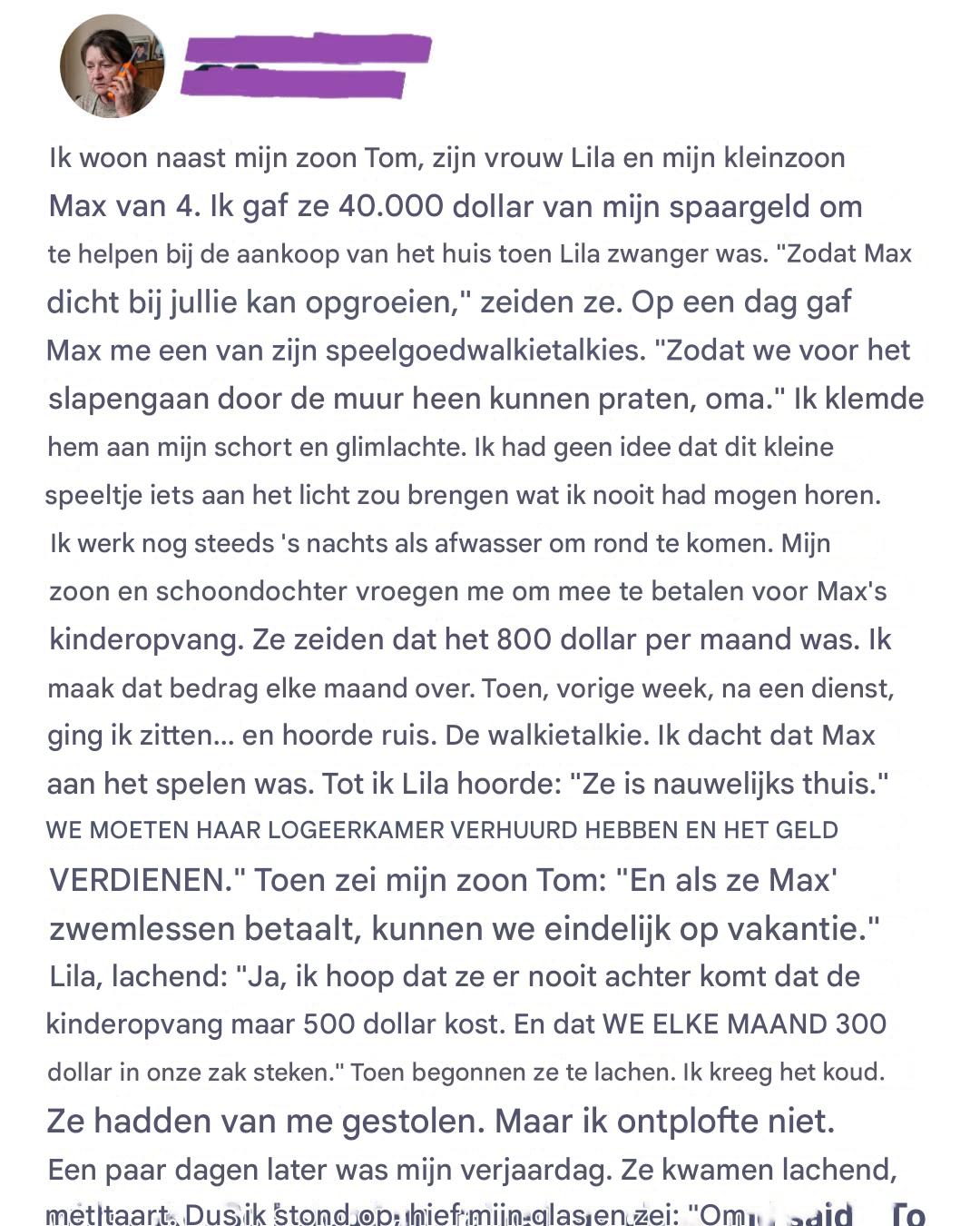 Mijn kleinzoon Max is vier, met zachte krullen en een hees lachje dat zelfs je somberste dag kan opvrolijken. Nog maar een week geleden hield hij met plakkerige vingers een van zijn plastic walkie-talkies omhoog en riep: « Oma Annie, deze is voor jou! »