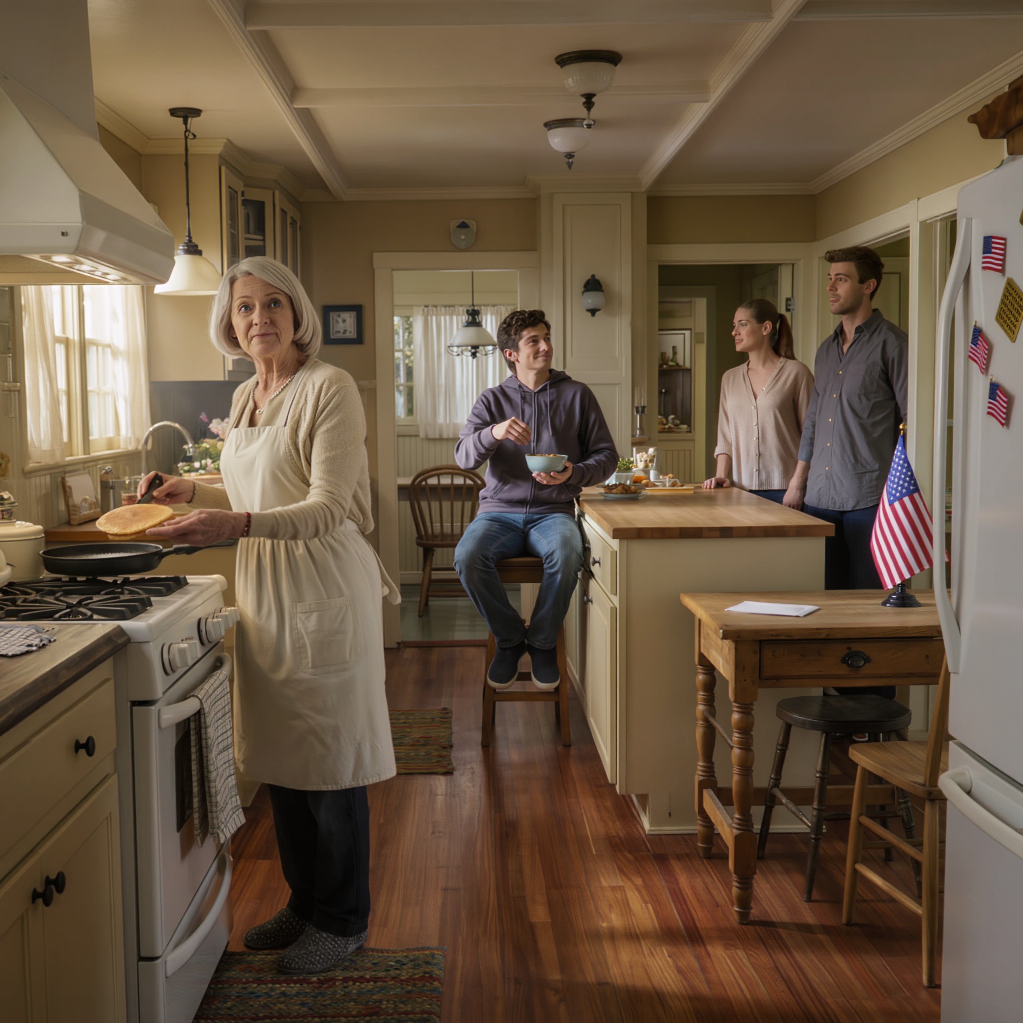 Ik stond bij het fornuis zijn favoriete bosbessenpannenkoeken te maken voor wat ik een lief ontbijtje voor oma en kleinzoon vond. Het beslag was perfect gemengd. De bakplaat was precies op temperatuur. Er steeg stoom op uit de pan, met de warme geur van vanille en boter die onze keuken normaal gesproken zo gezellig maakte.