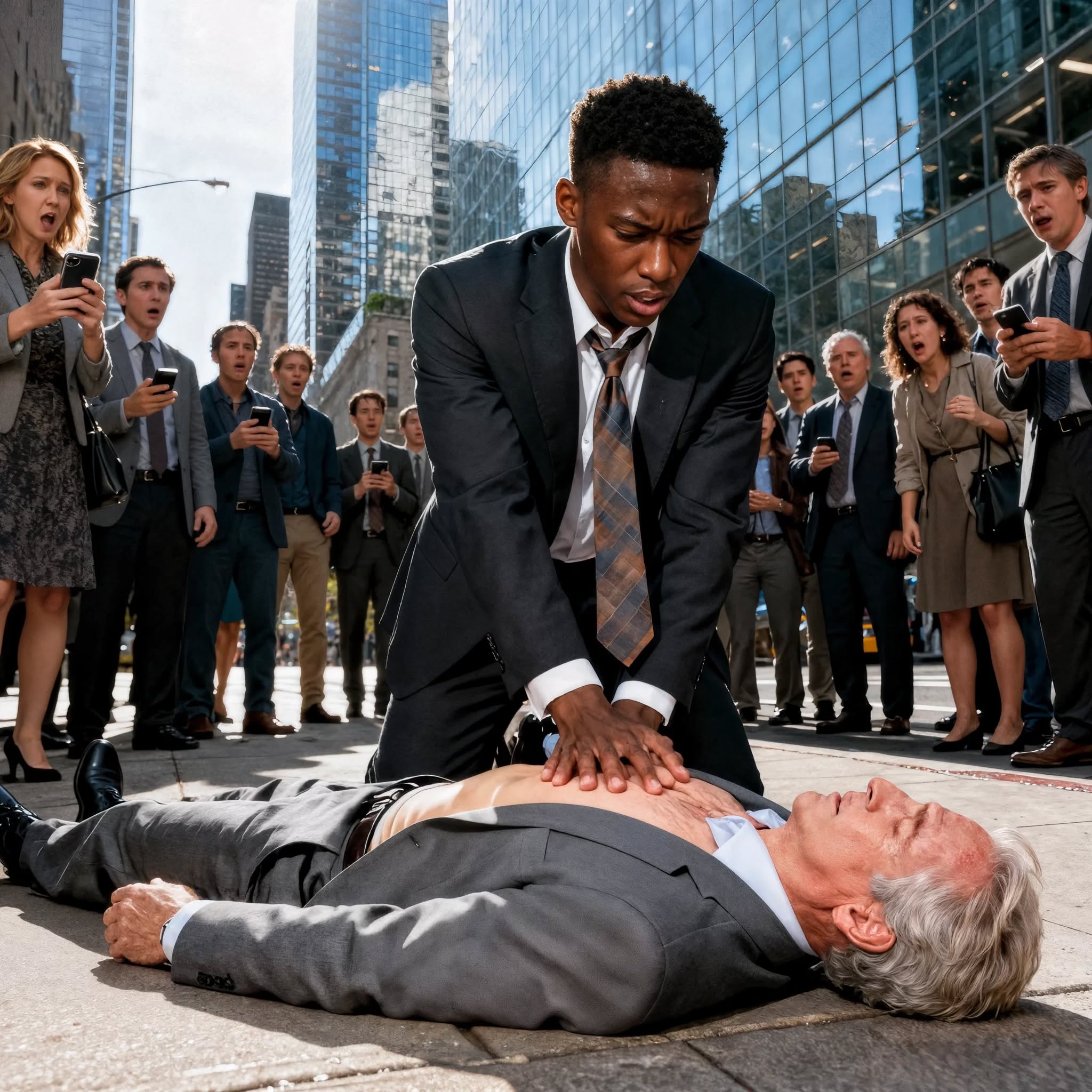 Maandenlang had hij zich voorbereid: schijninterviews, slapeloze nachten van het bestuderen van financiële modellen, het beoordelen van complexe zaken. Vandaag zou de dag zijn waarop hij eindelijk zijn waarde zou bewijzen. Hij liep snel over Fifth Avenue, een paar minuten te vroeg, toen een menigte op een straathoek zijn aandacht trok.