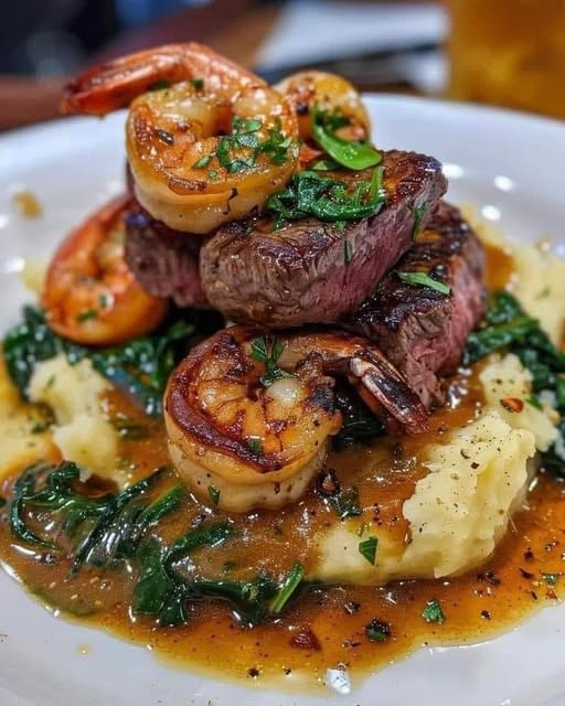Deze maaltijd is een echte traktatie! Het combineert de rijke smaak van een perfect gebakken steak met pittige, romige Cajun garnalen. De geroerbakte spinazie en de zachte aardappelpuree van Yukon aardappelen maken het geheel af. Perfect voor een speciale gelegenheid of een weekendmaaltijd waar je echt van wilt genieten.