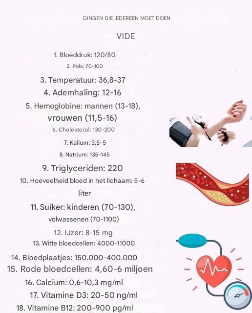 Het is belangrijk om bepaalde referentiewaarden voor het menselijk lichaam te kennen om klinische basistests te kunnen interpreteren en mogelijke aandoeningen tijdig te kunnen detecteren. Hoewel overleg met een arts altijd noodzakelijk is voor een nauwkeurige diagnose, kan algemene kennis u helpen om weloverwogen beslissingen te nemen over uw welzijn. Hieronder presenteren we de belangrijkste parameters en hun geschatte normaalwaarden.