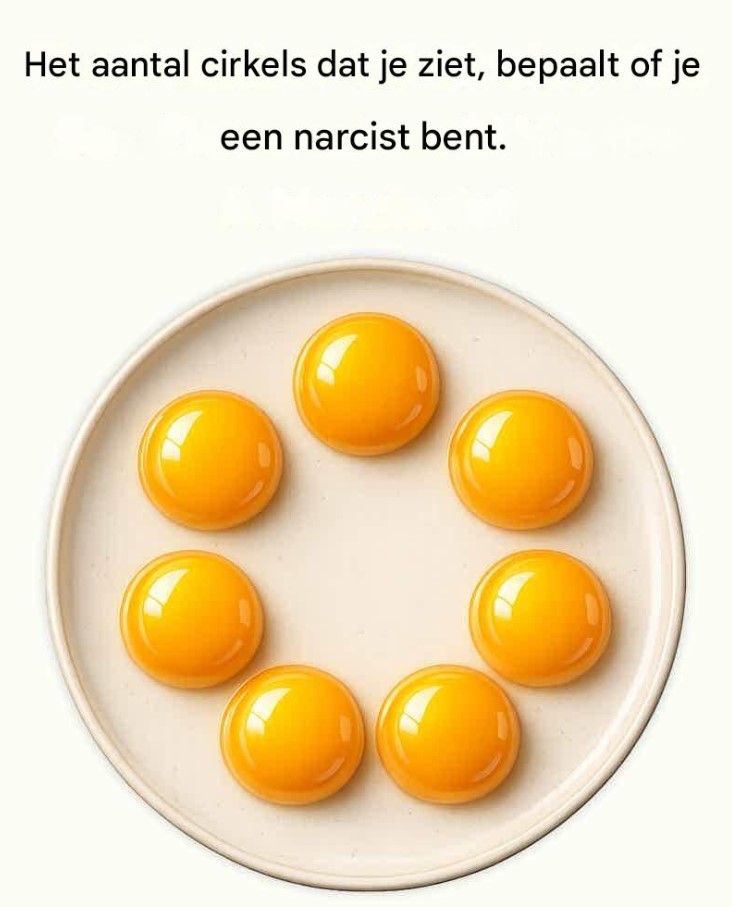 Op het eerste gezicht lijkt de afbeelding onschuldig: een schoon bord, zeven glanzende eierdooiers in een bijna perfecte cirkel, en een opvallende kop die beweert dat het aantal cirkels dat je ziet kan bepalen of je een narcist bent.