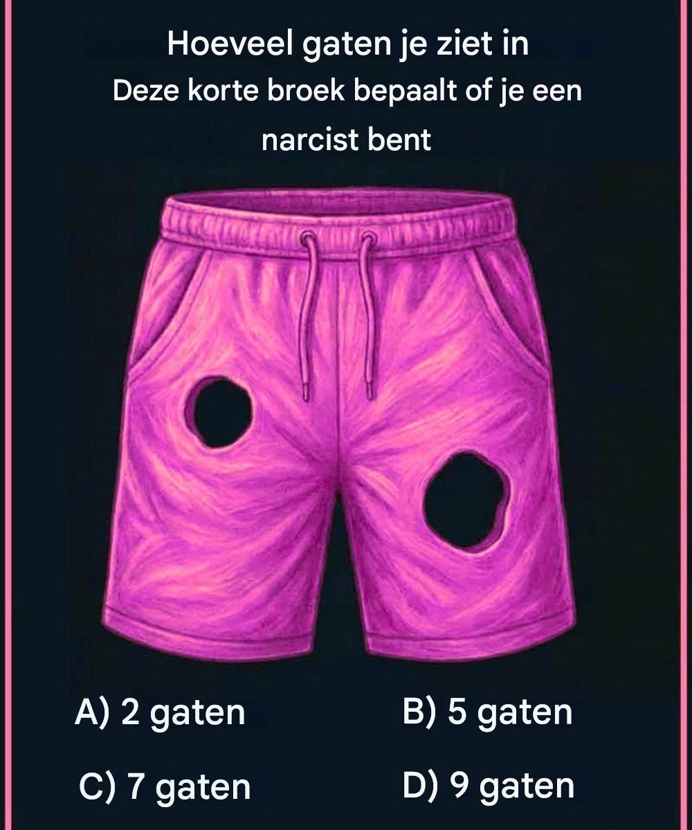 Op het eerste gezicht lijkt deze virale afbeelding niets meer dan een paar beschadigde shorts. Maar zodra je de titel leest – « Hoeveel gaten je in deze shorts ziet, bepaalt of je een narcist bent » – schakelt je brein onmiddellijk over van passief scrollen naar een analytische modus. En dat is precies waarom deze optische puzzel de sociale media heeft veroverd: het daagt je waarneming uit en plaagt tegelijkertijd je ego.