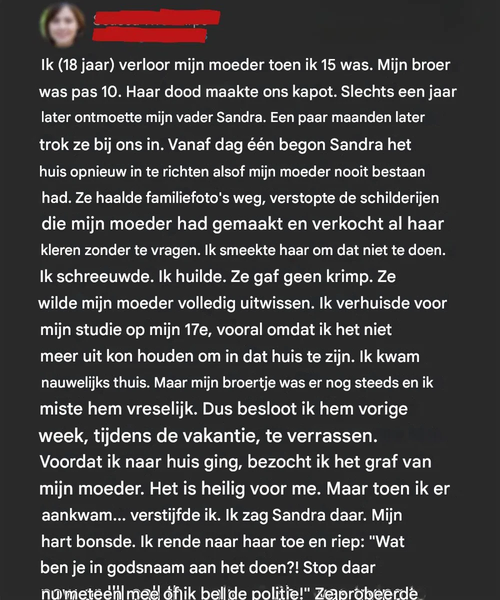 Maar alles veranderde toen mijn vader hertrouwde met Sandra, een vrouw wier zachte stem en zwierige rokken vreemd leken in een huis dat nog steeds de warmte van mijn moeder uitstraalde.