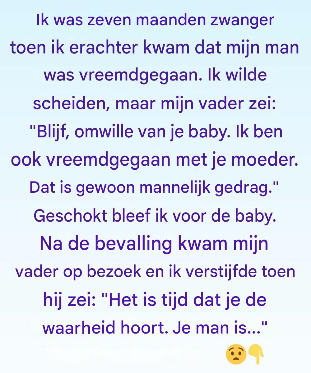 ‘Ik ben vreemdgegaan met je moeder toen ze zwanger was,’ zei hij zachtjes. ‘Het is… mannelijke fysiologie. Het betekent niets.’