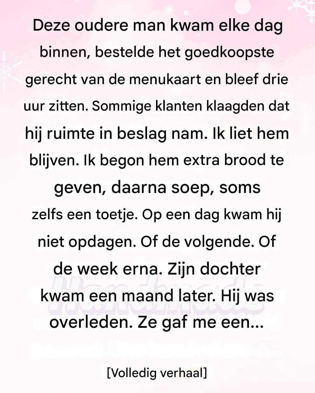 Na een tijdje begon ik hem stiekem extraatjes te geven. Een mandje brood. Een kom soep. Op een keer, toen de taart vers uit de oven kwam, schoof ik een stuk op zijn tafel. Hij vroeg er nooit om, verwachtte het nooit. Hij keek me alleen maar aan met ogen vol stille dankbaarheid, alsof ik hem meer dan alleen eten had gegeven. Alsof ik hem het bewijs had gegeven dat hij er nog steeds toe deed.